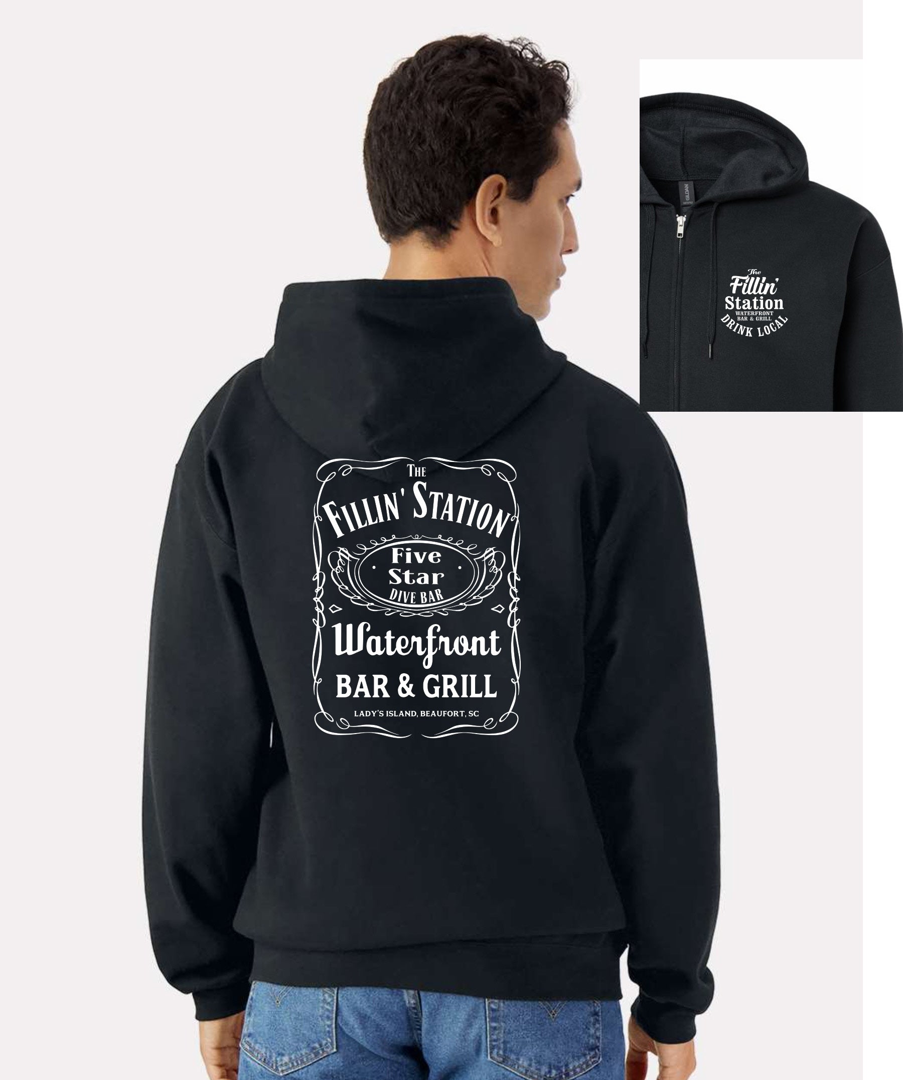 Smooth, bold, and unmistakably classic — just like your favorite bottle on the shelf. This zip-up hoodie brings a little barroom attitude to your everyday wear with a design inspired by that classic whiskey label. Whether you’re staying warm by the water or headed out for the night, it’s the perfect blend of comfort and character that feels right at home at The Fillin’ Station.
